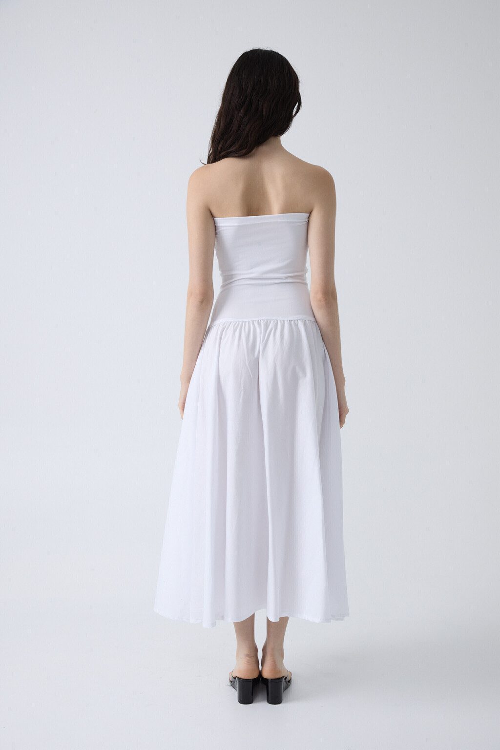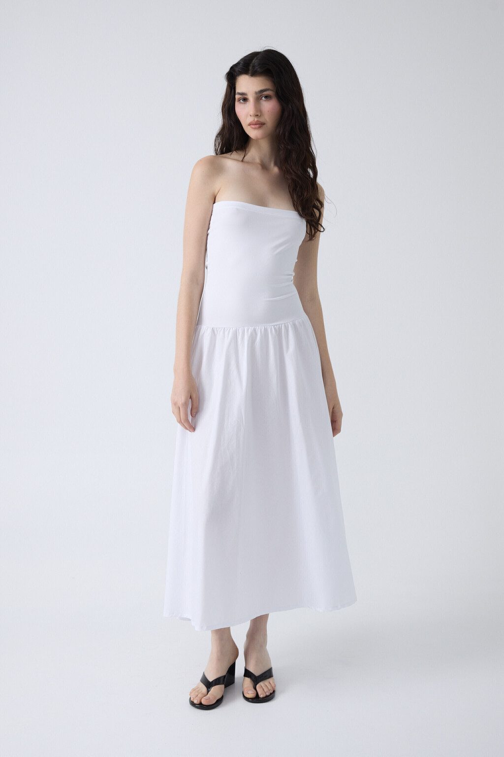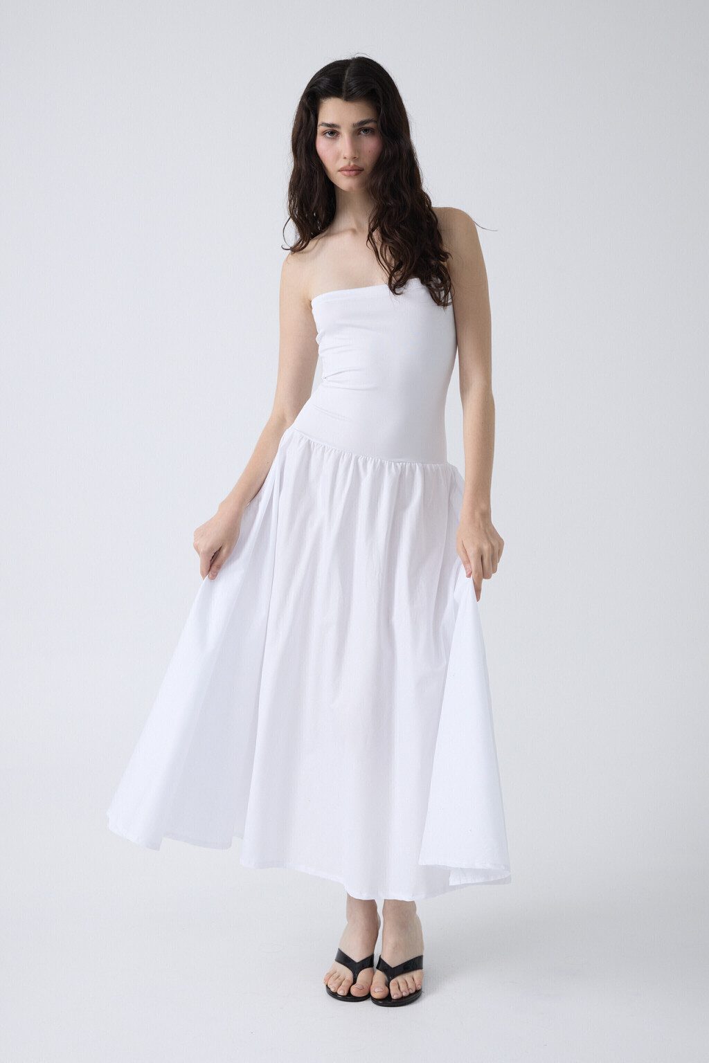La versatilidad definitiva en una sola prenda: usalo como vestido strapless o como pollera midi. Este diseño inteligente combina un busto de microfibra elastizada que sostiene y estiliza sin comprimir, con una falda en poplín de algodón que aporta estructura, movimiento natural y cero transparencia. Una silueta limpia y clásica que no se baja, no marca y se adapta a distintos cuerpos. Ideal para resolver tu look de día o noche con practicidad y estilo sin esfuerzo.